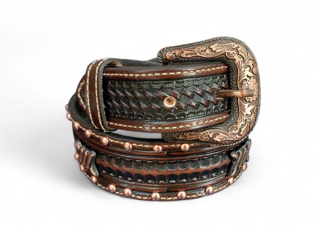 • Fivela em metal niquelada toda trabalhada e passador removível em couro;