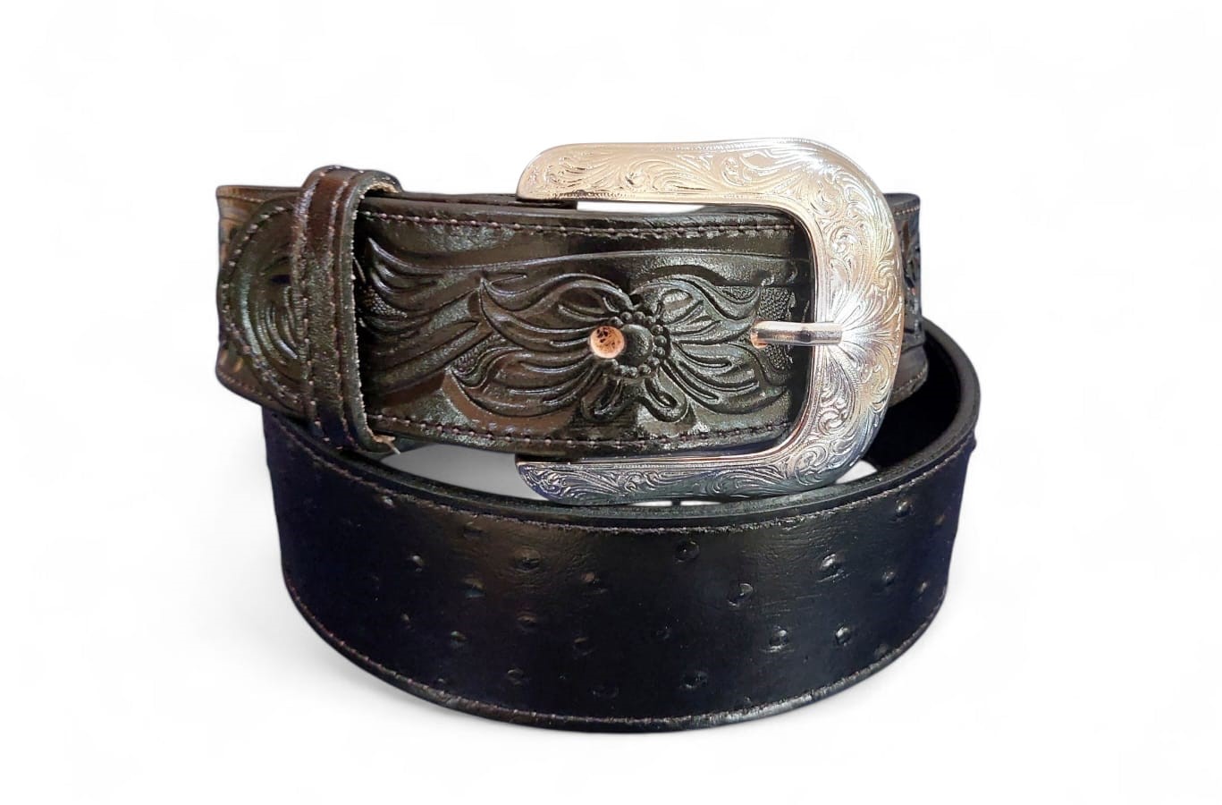 • Fivela em metal niquelada toda trabalhada e passador removível em couro;