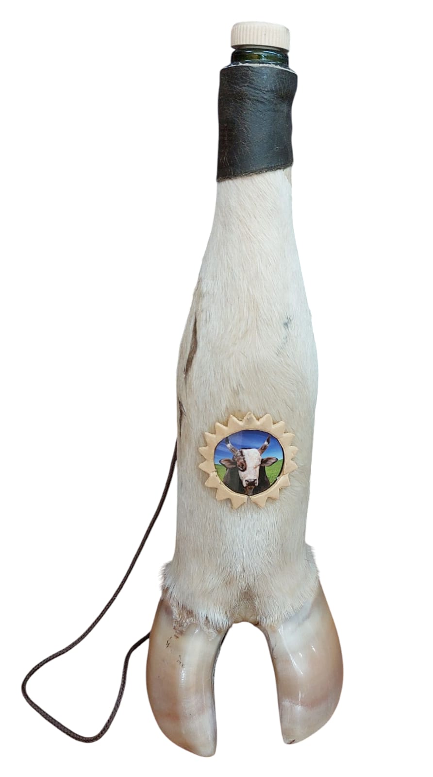 Garrafa Pé de Boi, produzida artesanalmente com pé de boi natural na parte externa, interior é uma garrafa de vidro, para manter e conservar a temperatura da sua bebida.